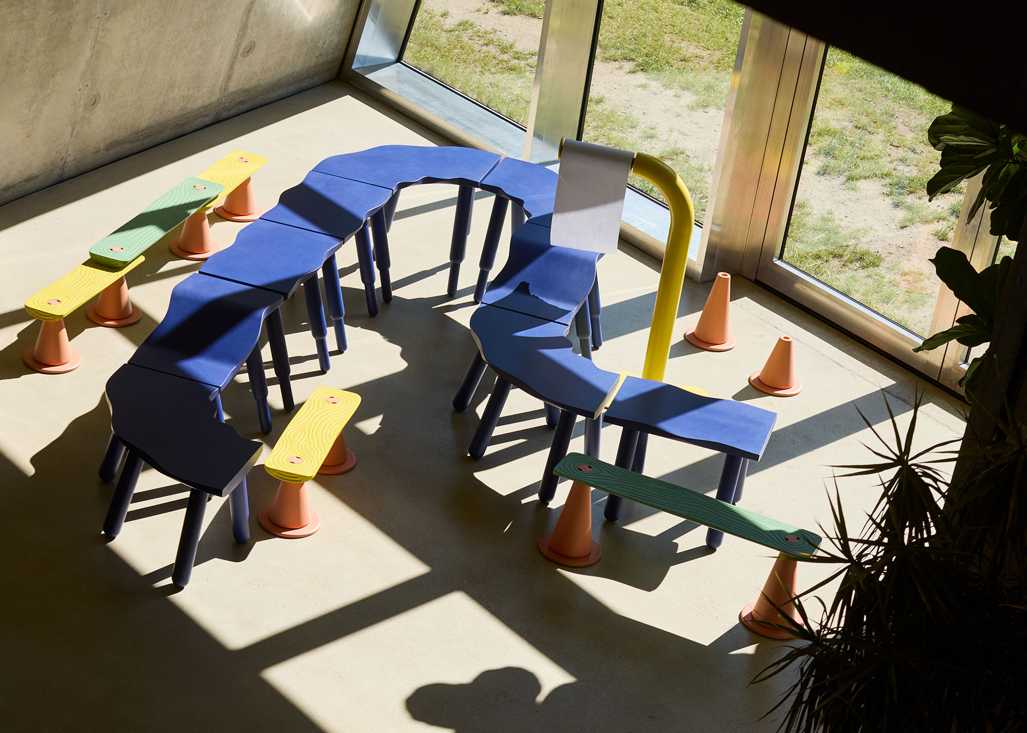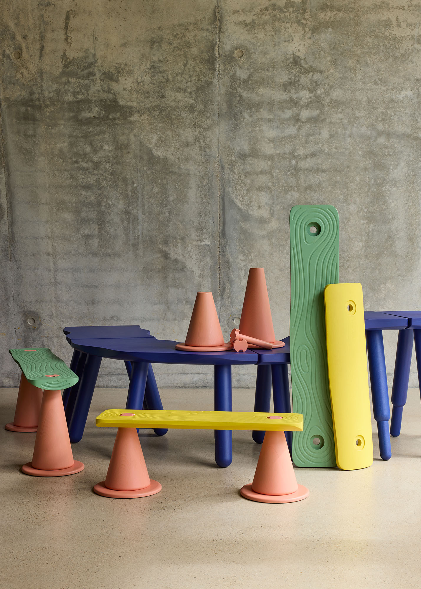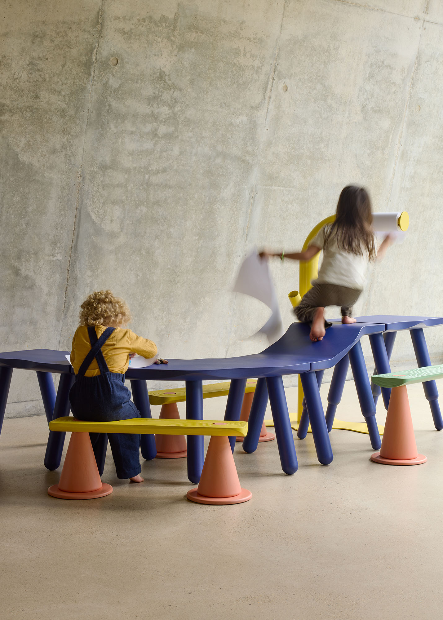 For the children's play area in the Atrium of Spore Initiative in Berlin we designed a furniture set titled Tactical Furniture. The intention was to create a landscape with the help of various pieces of furniture that can be combined with each other and arranged by the children themselves. The Tactical Furniture Ensemble consists of the Canal Table, the Pylon Bench, the Paper Tree and the Display Tree.
