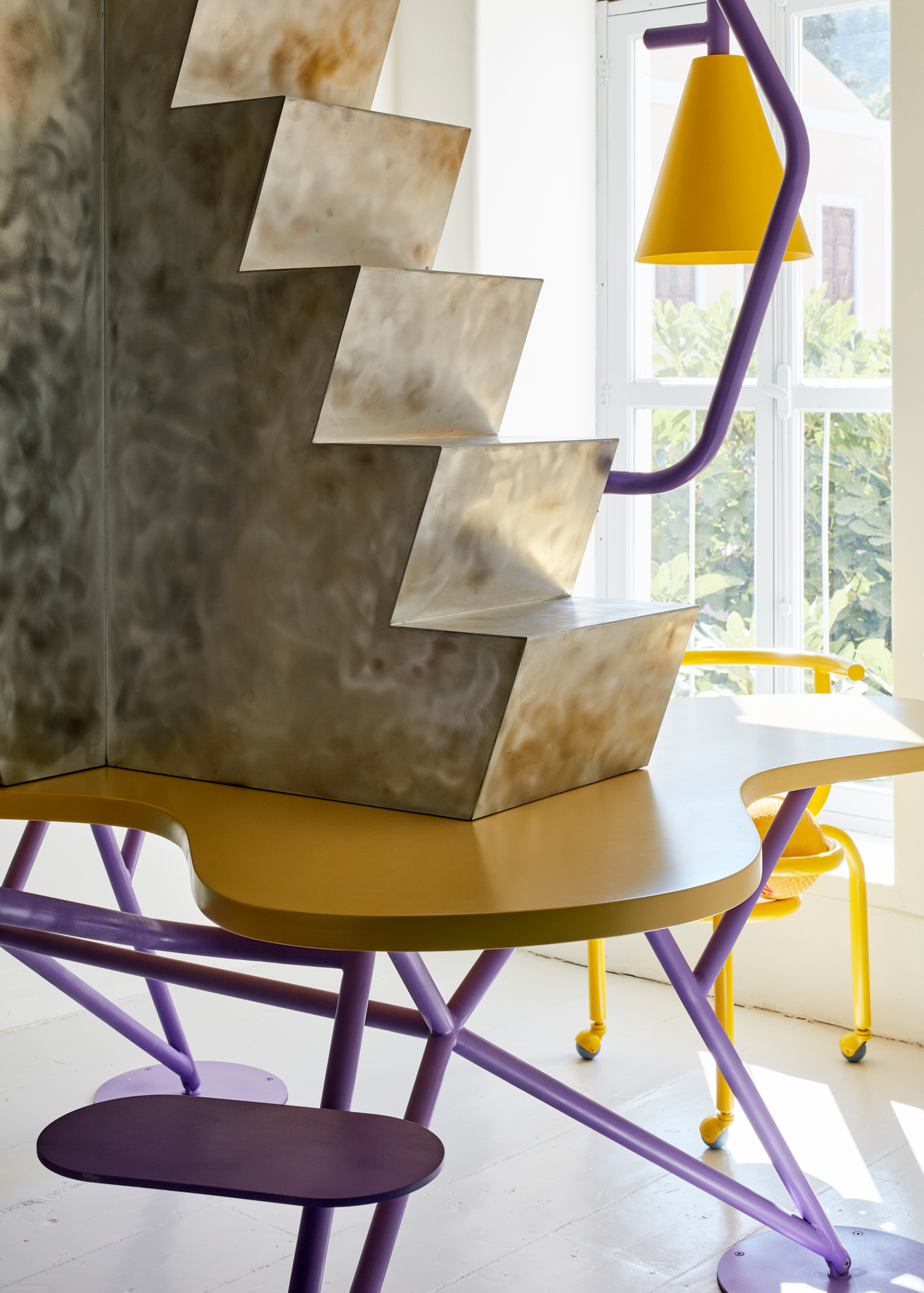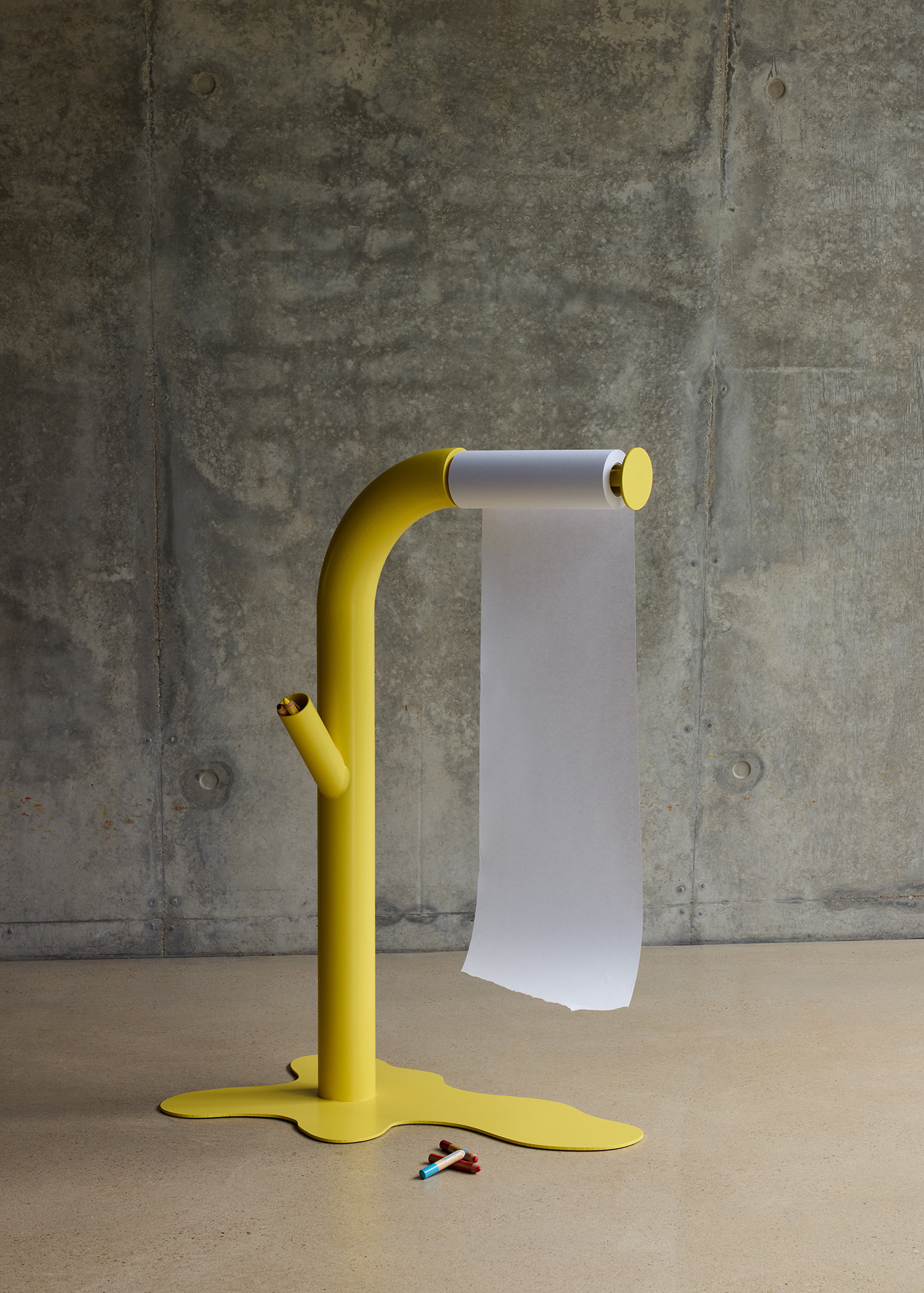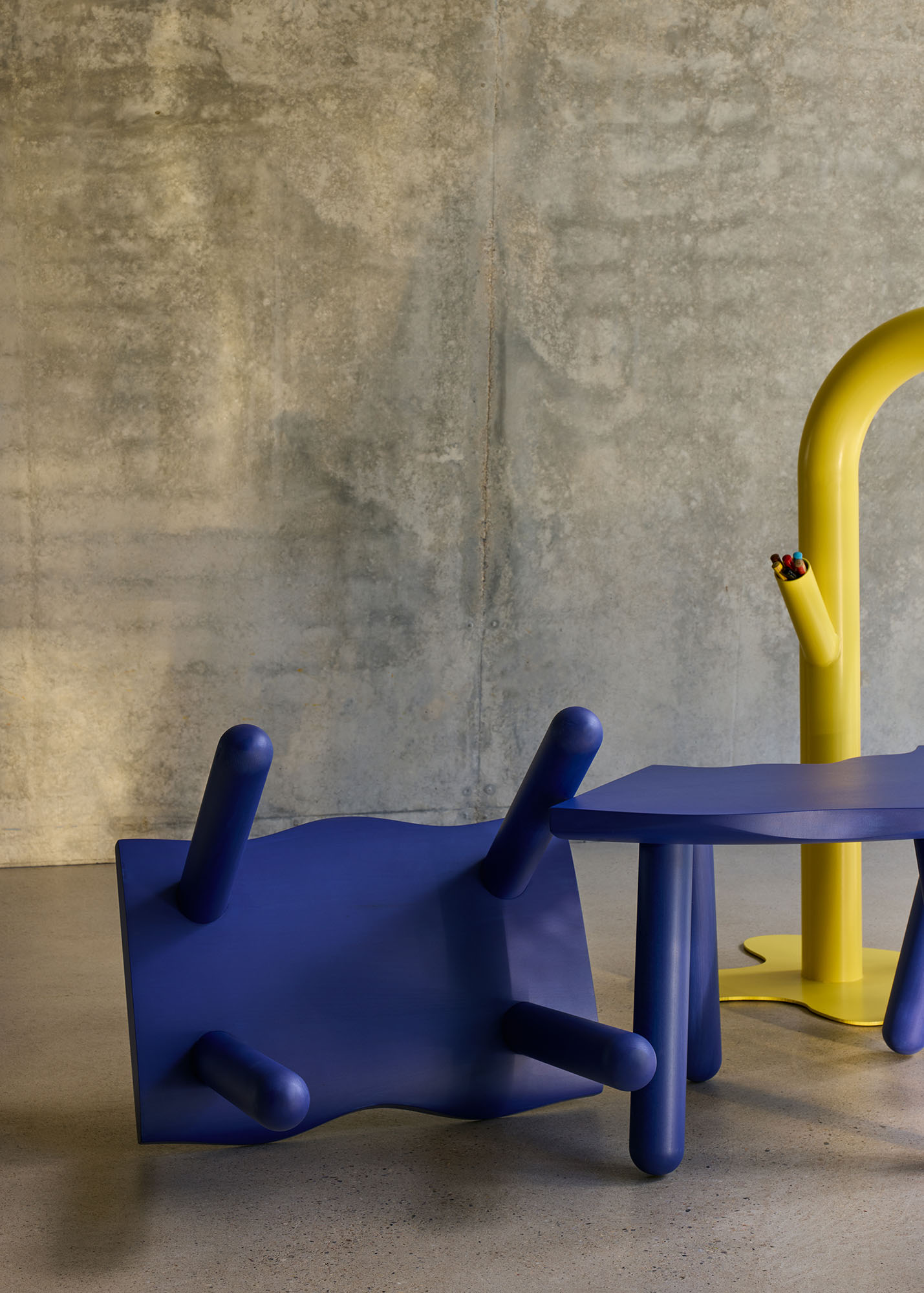 For the children's play area in the Atrium of Spore Initiative in Berlin we designed a furniture set titled Tactical Furniture. The intention was to create a landscape with the help of various pieces of furniture that can be combined with each other and arranged by the children themselves. The Tactical Furniture Ensemble consists of the Canal Table, the Pylon Bench, the Paper Tree and the Display Tree.