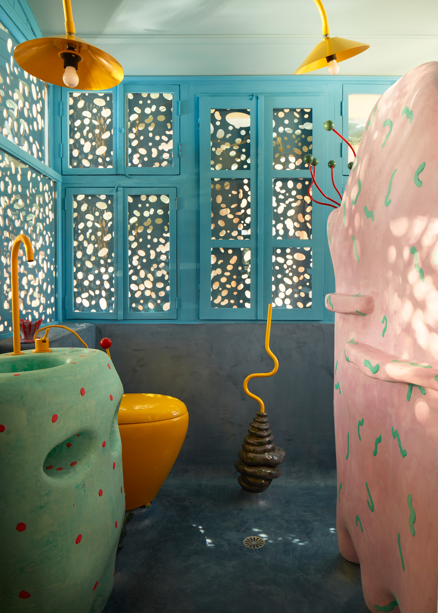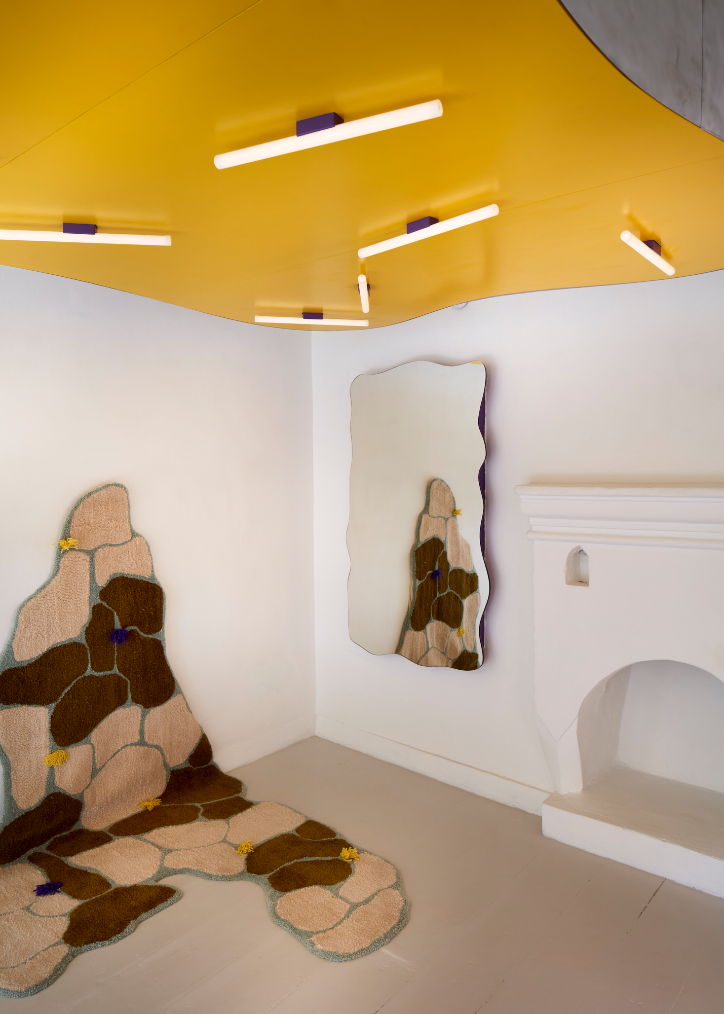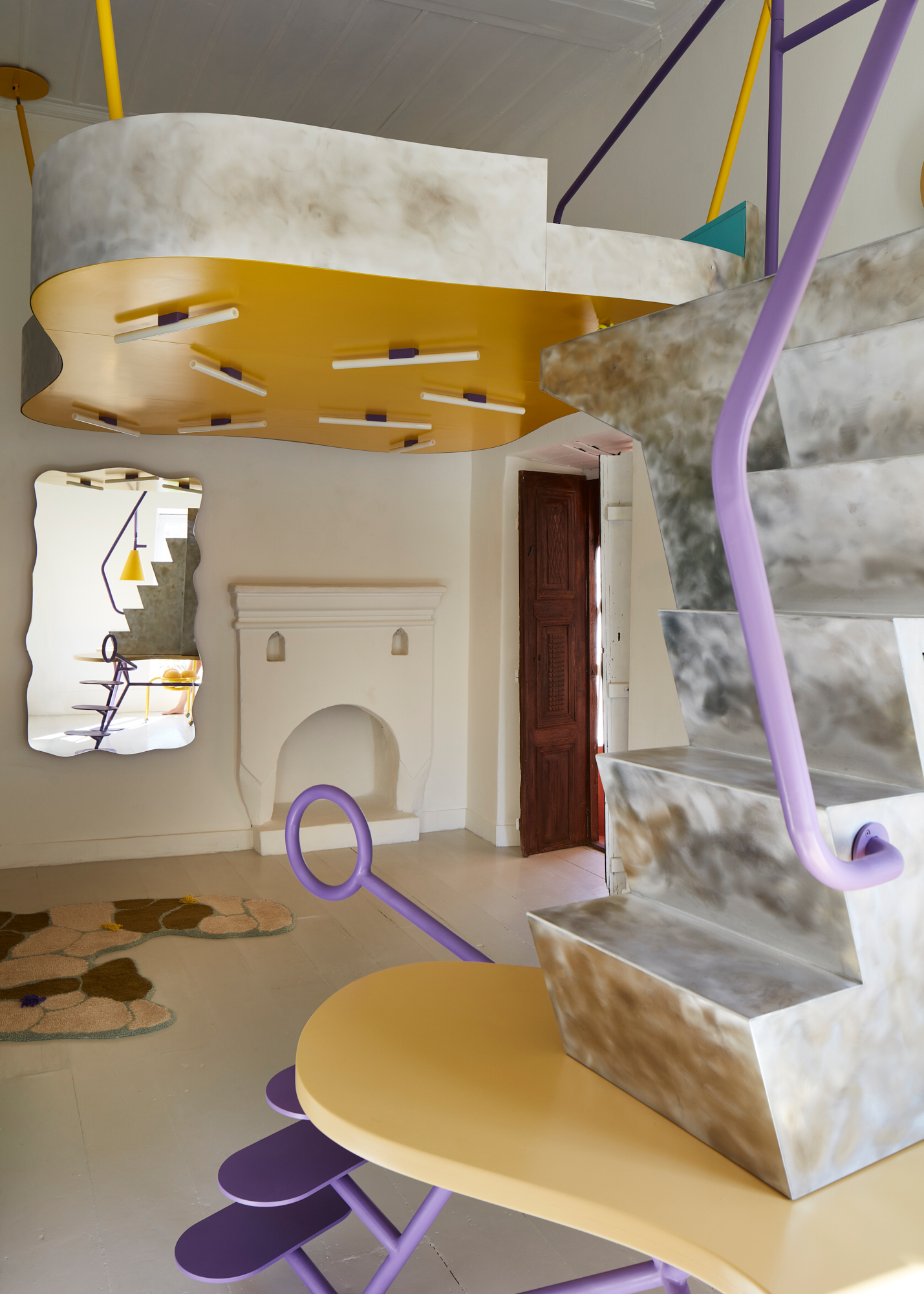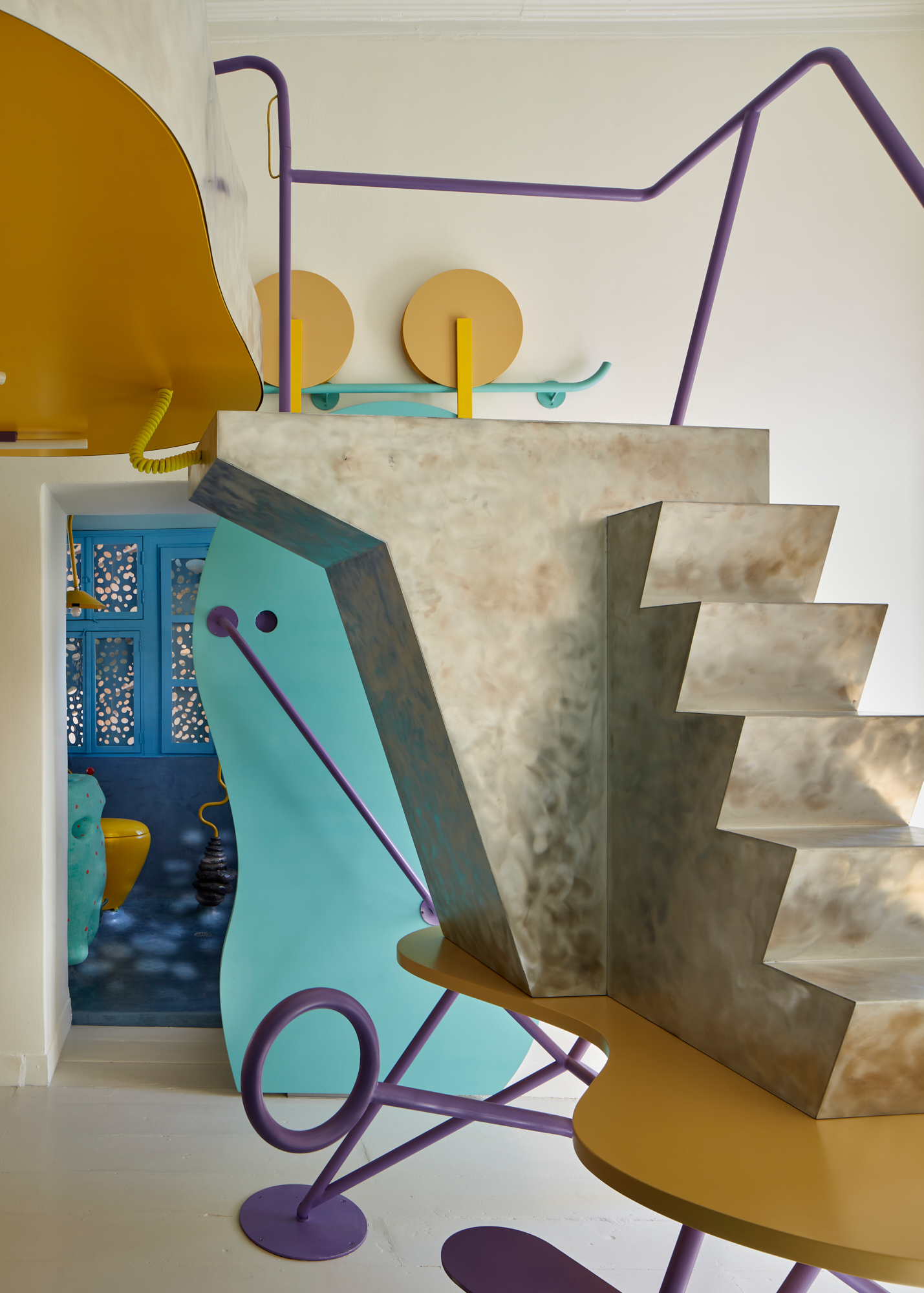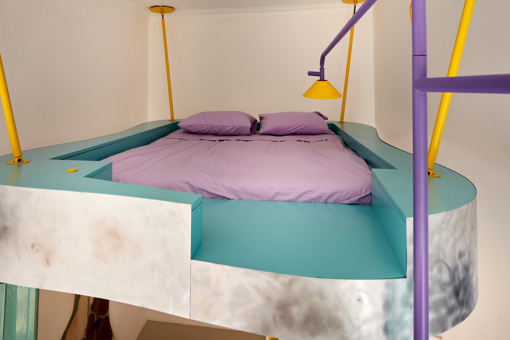 Chimaeres  is a conceptual space that we designed as und.studio within the 4Rooms Project for Società delle Api  on the Greek island of Kastellorizzo. The concept is borrowing its name from the greek beasts, that are neither one creature nor the other but wicked hybrids. Every object we decided to place in the space is taking over not one, but a multitude of opposing functions. In the middle of the space hangs a chandelier you can climb up to sleep. A large object combines desk, cabinet, floor lamp and a flight of stairs. The object holding together a bunch of beach balls doubles as a chair while plants are growing from the rug. A mirror slides away to give access to the bathroom that lets you shower between functionalist corals and sea slugs in the deep ocean. Stepping out on the balcony lets you arrive in a glowing desert inhabited by artificial plants.