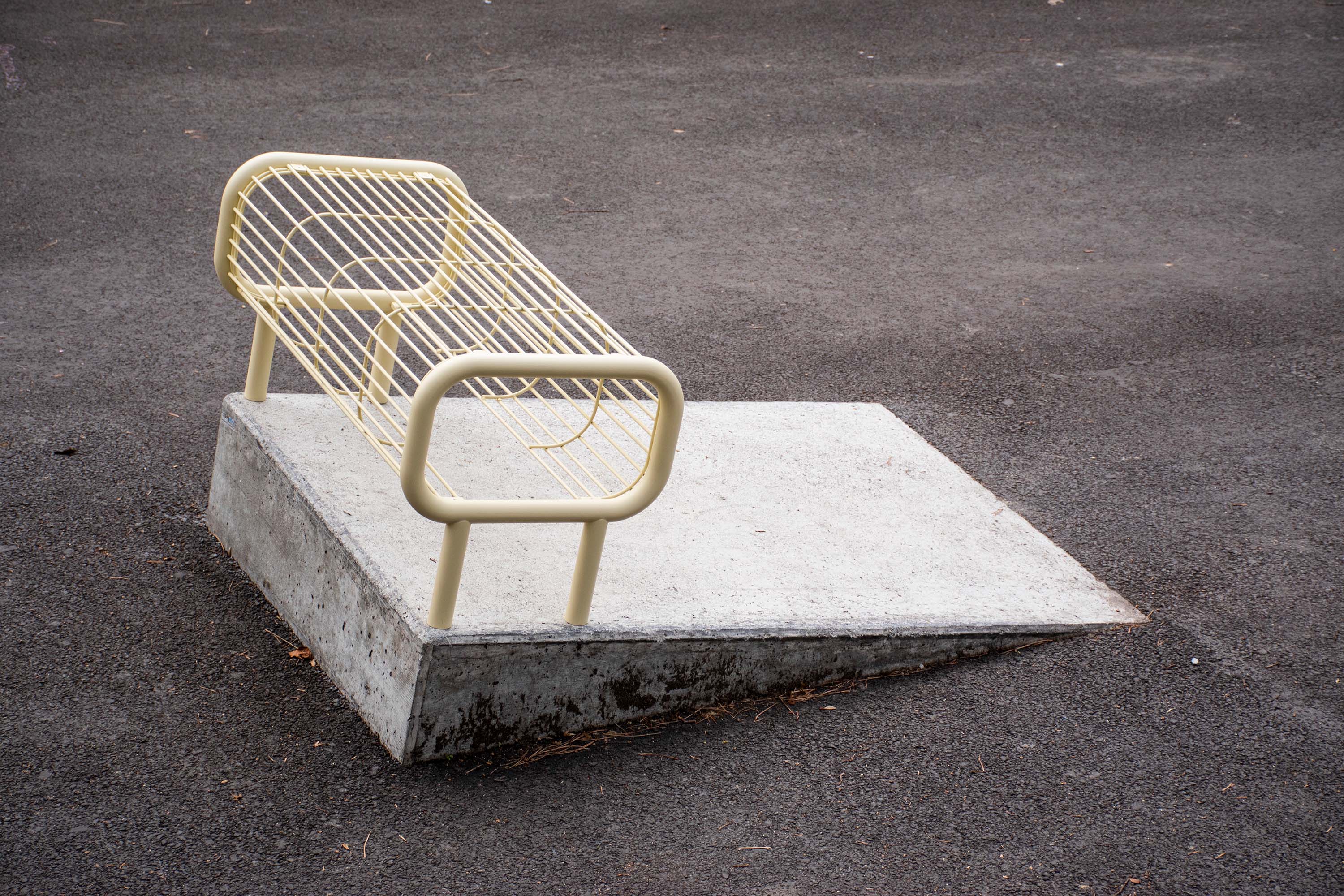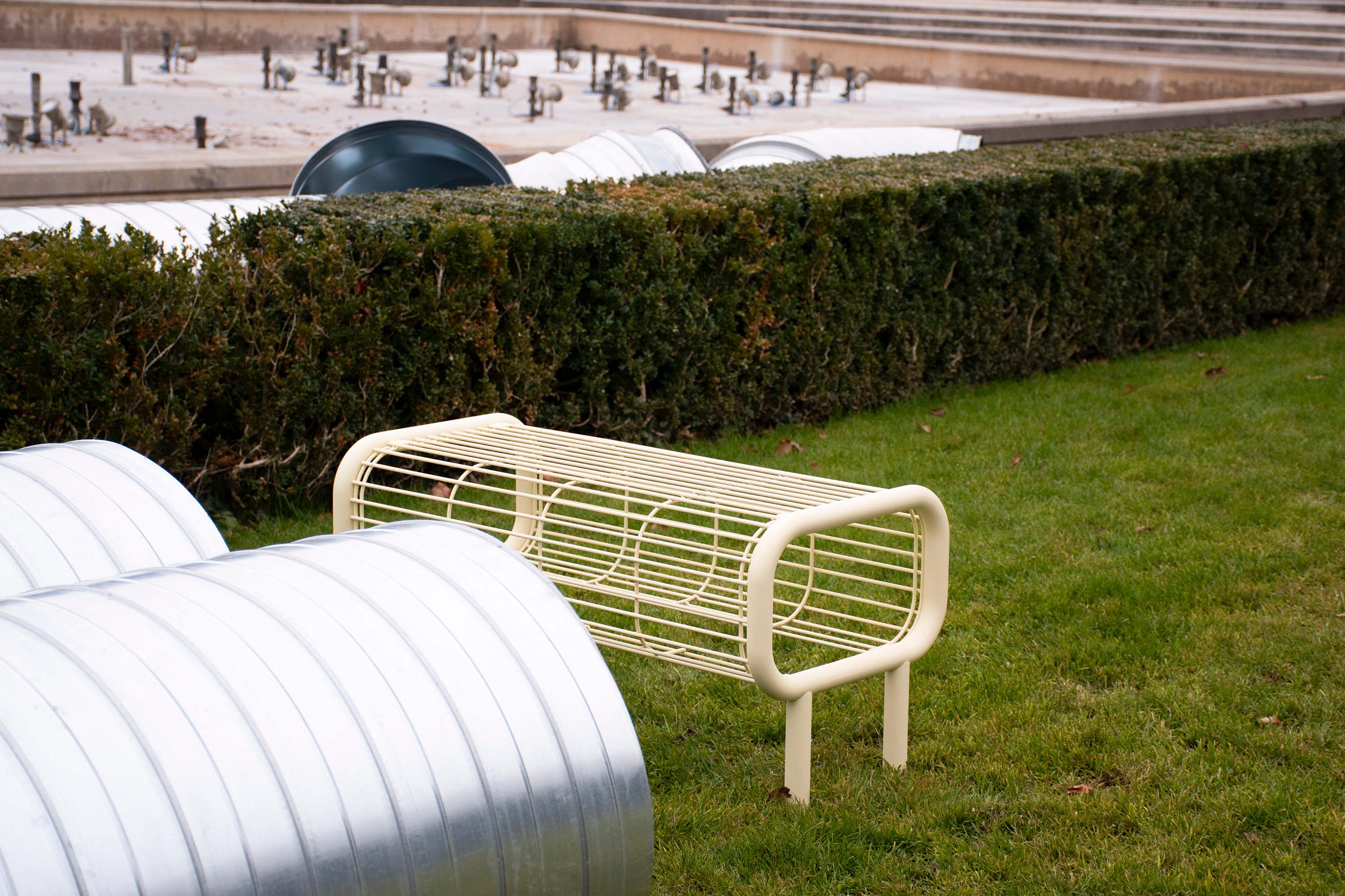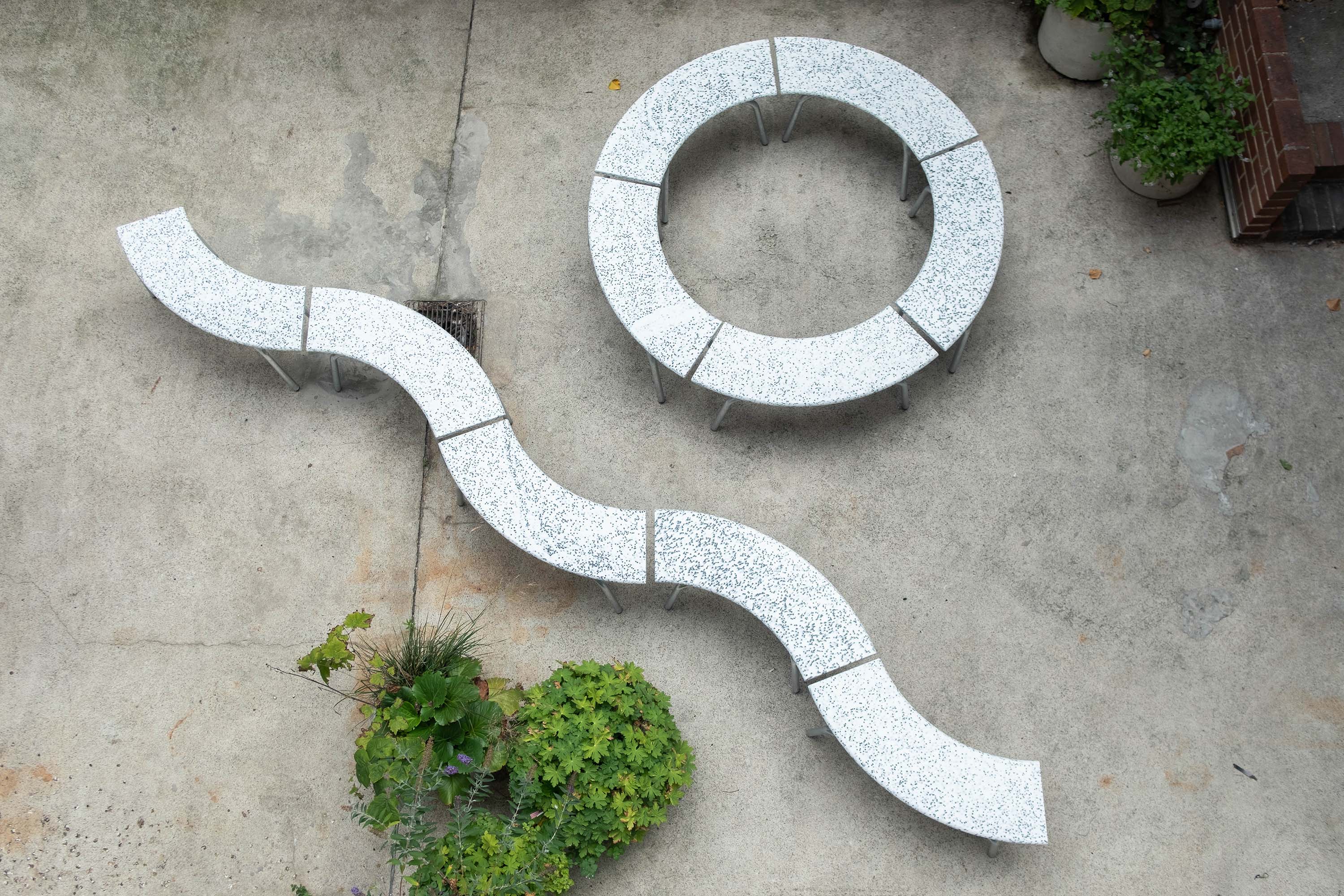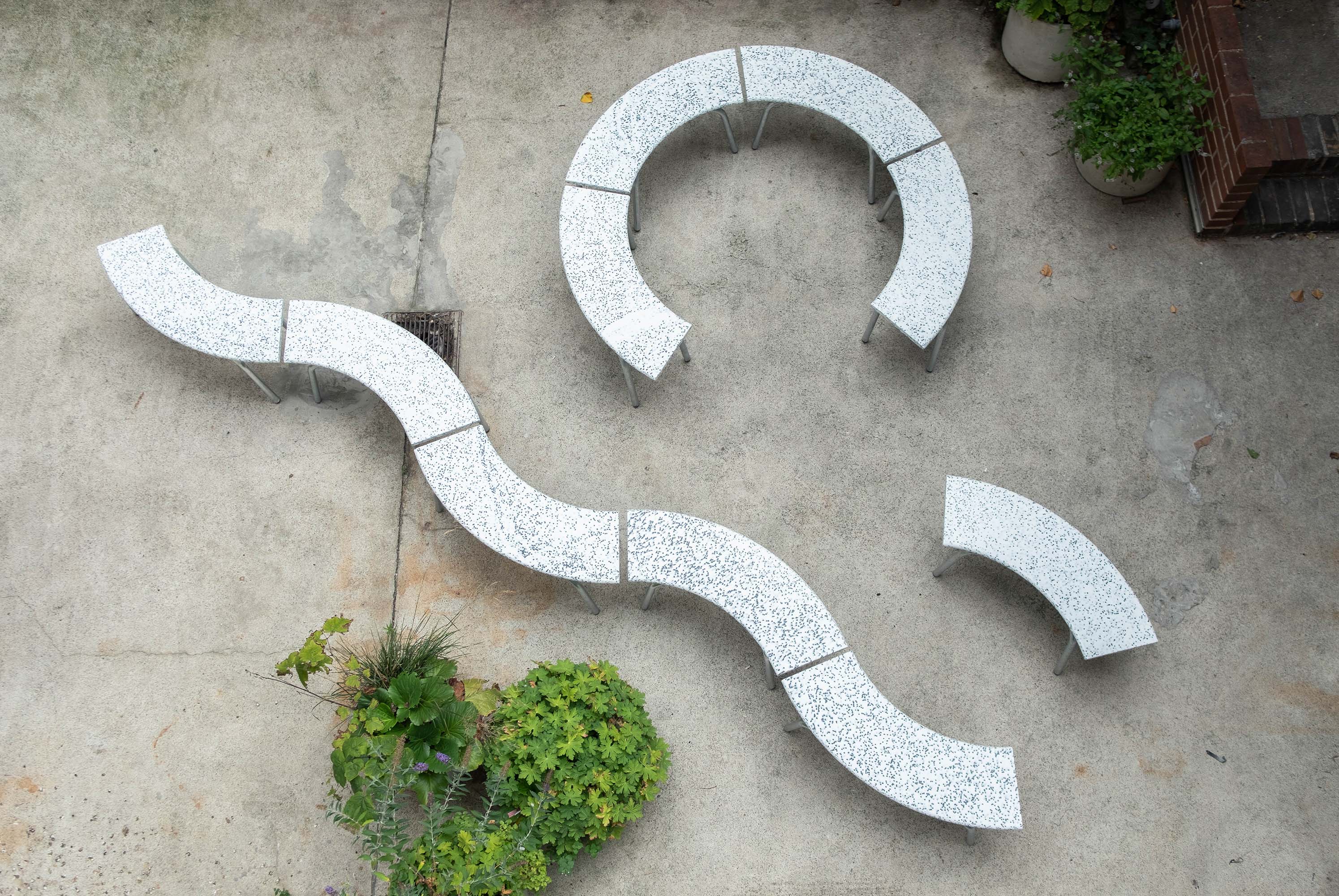 For the DAAD Gallery Berlin, we designed a bench that can be arranged into the wildest seating formations due to its 70° curve. It reflects the concrete courtyard of the gallery and withstands the sun and wind. The bench is made out of a fifth circular curve of PE plate and two bended and galvanized steeltubes which are rounded with half-spheres as feets.