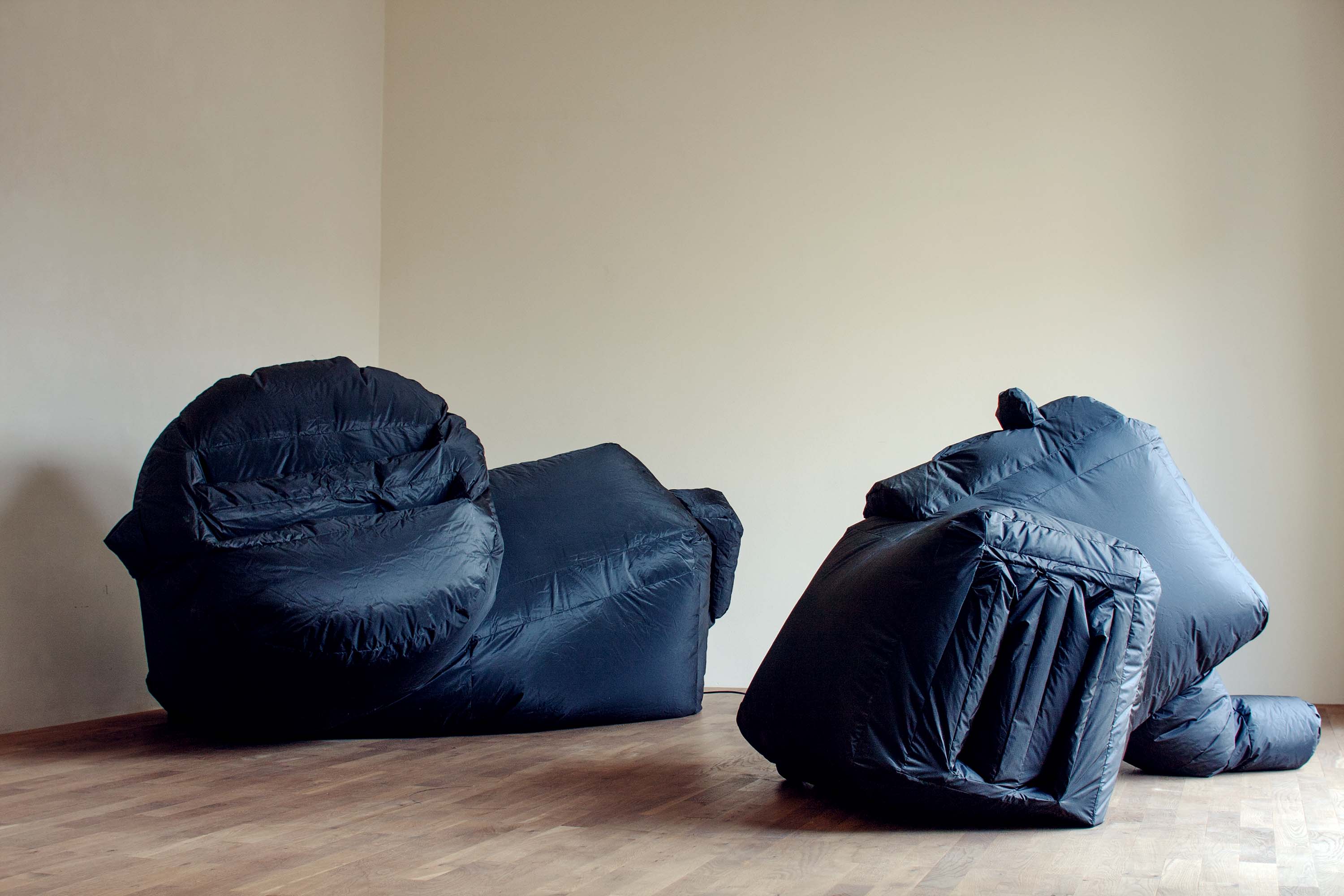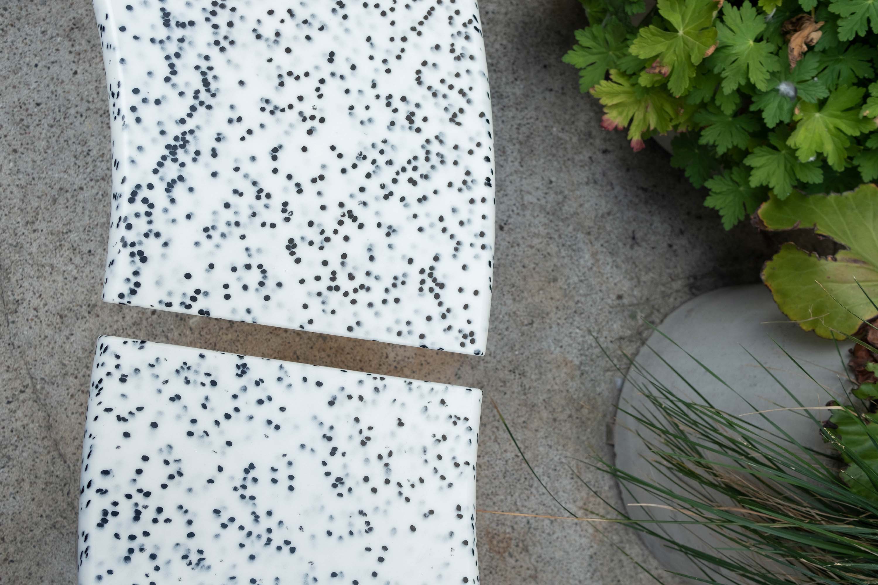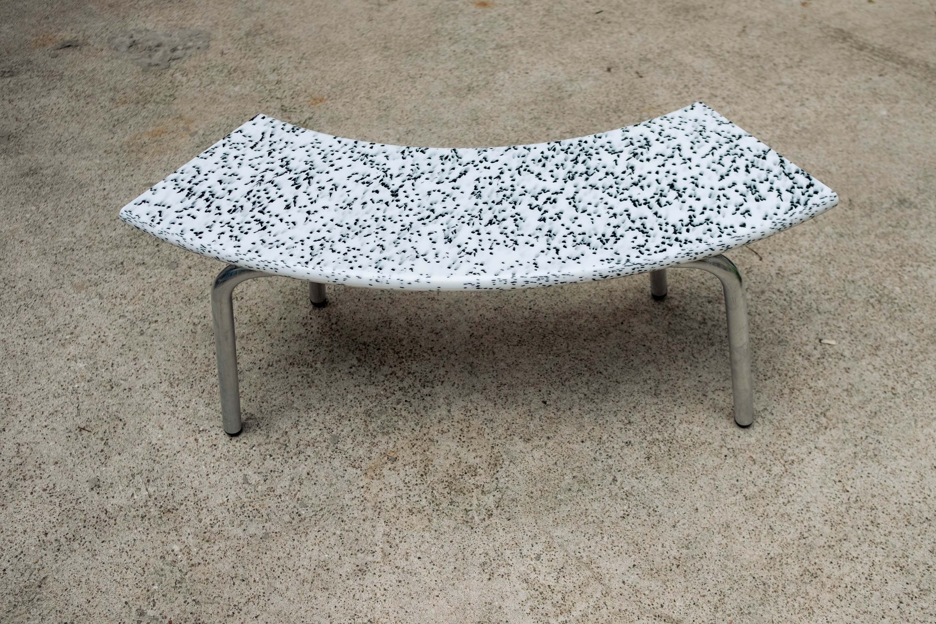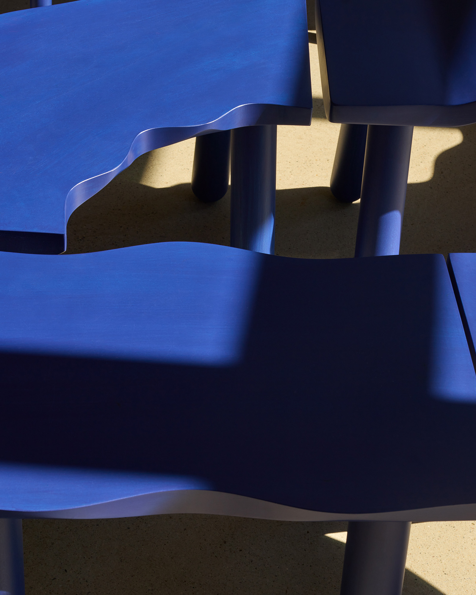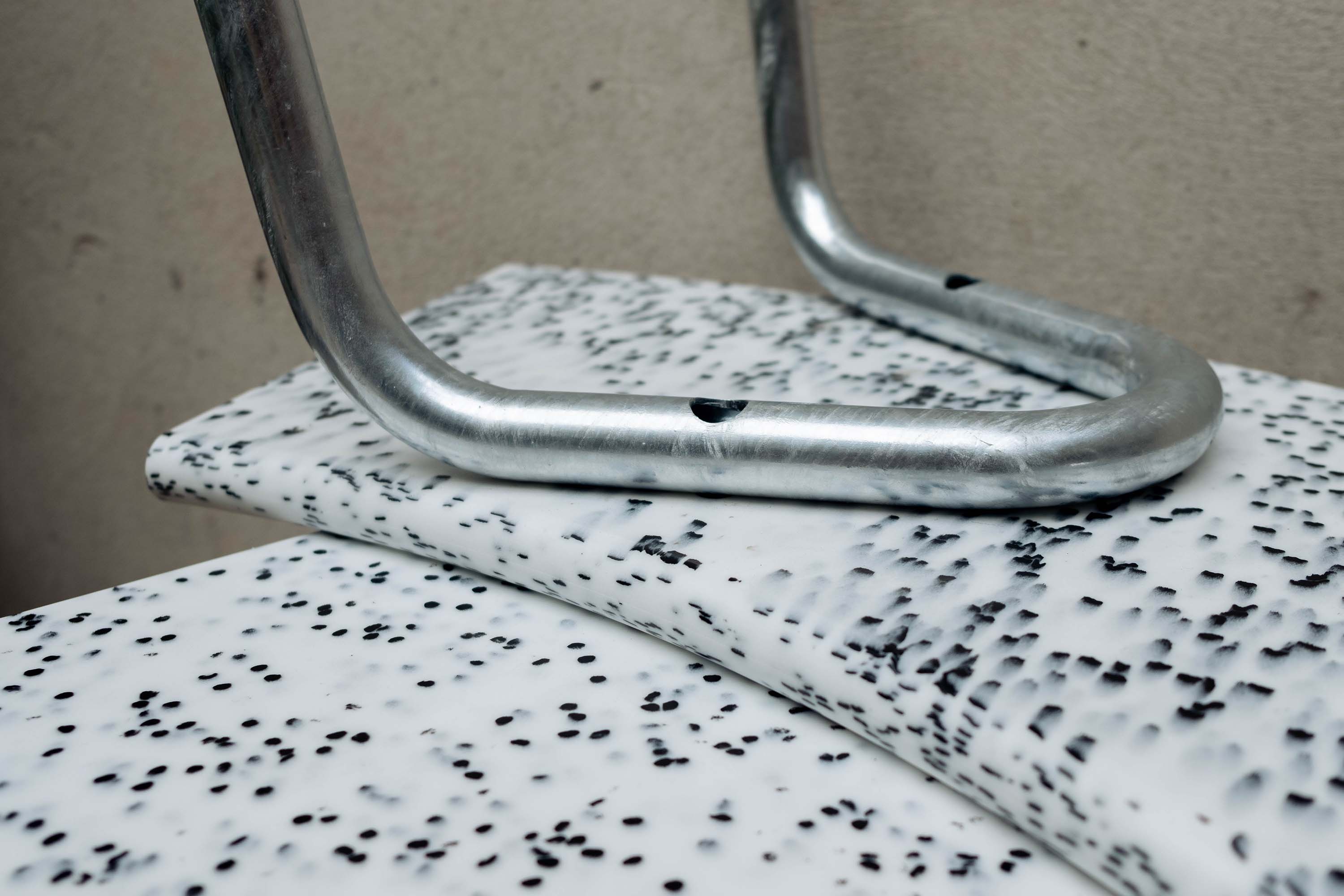 For the DAAD Gallery Berlin, we designed a bench that can be arranged into the wildest seating formations due to its 70° curve. It reflects the concrete courtyard of the gallery and withstands the sun and wind. The bench is made out of a fifth circular curve of PE plate and two bended and galvanized steeltubes which are rounded with half-spheres as feets.