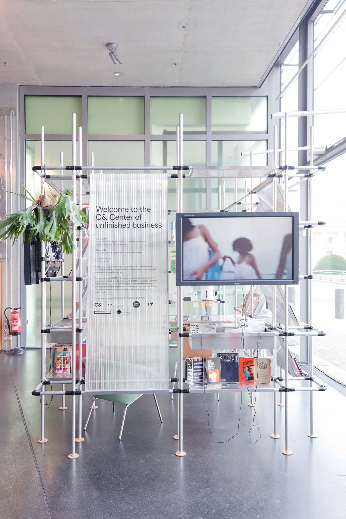 For the platform Contemporary And (C&) we designed the Center of Unfinished Business as a reading room original for the Ifa Gallery Berlin. The starting point was the question of how to represent the location of an archive while at the same time developing it into a place of encounter and deepening. From this, we have developed an open and permeable structure. The shelving system is a room-in-a-room and is used both from the outside and from the inside.