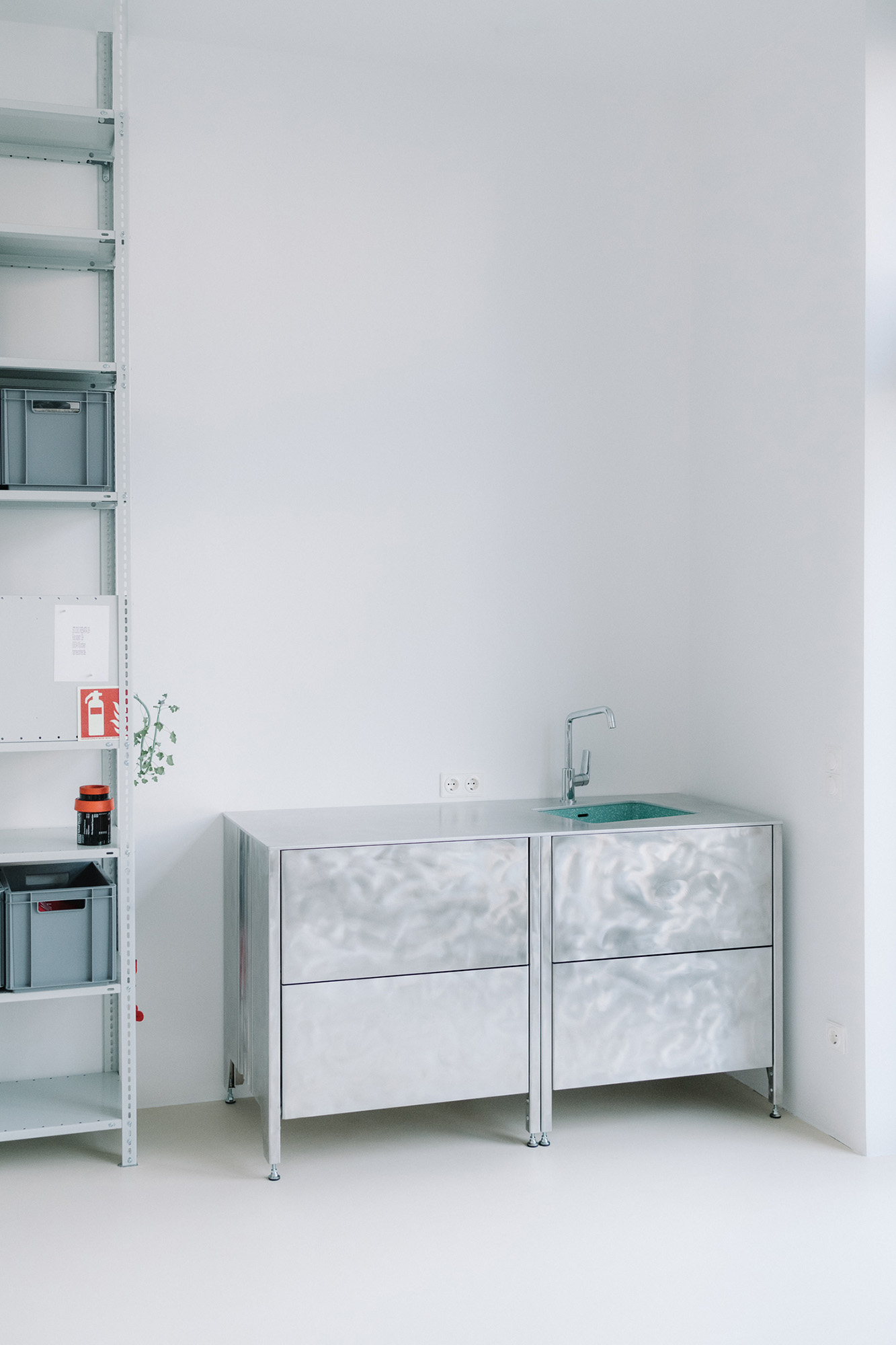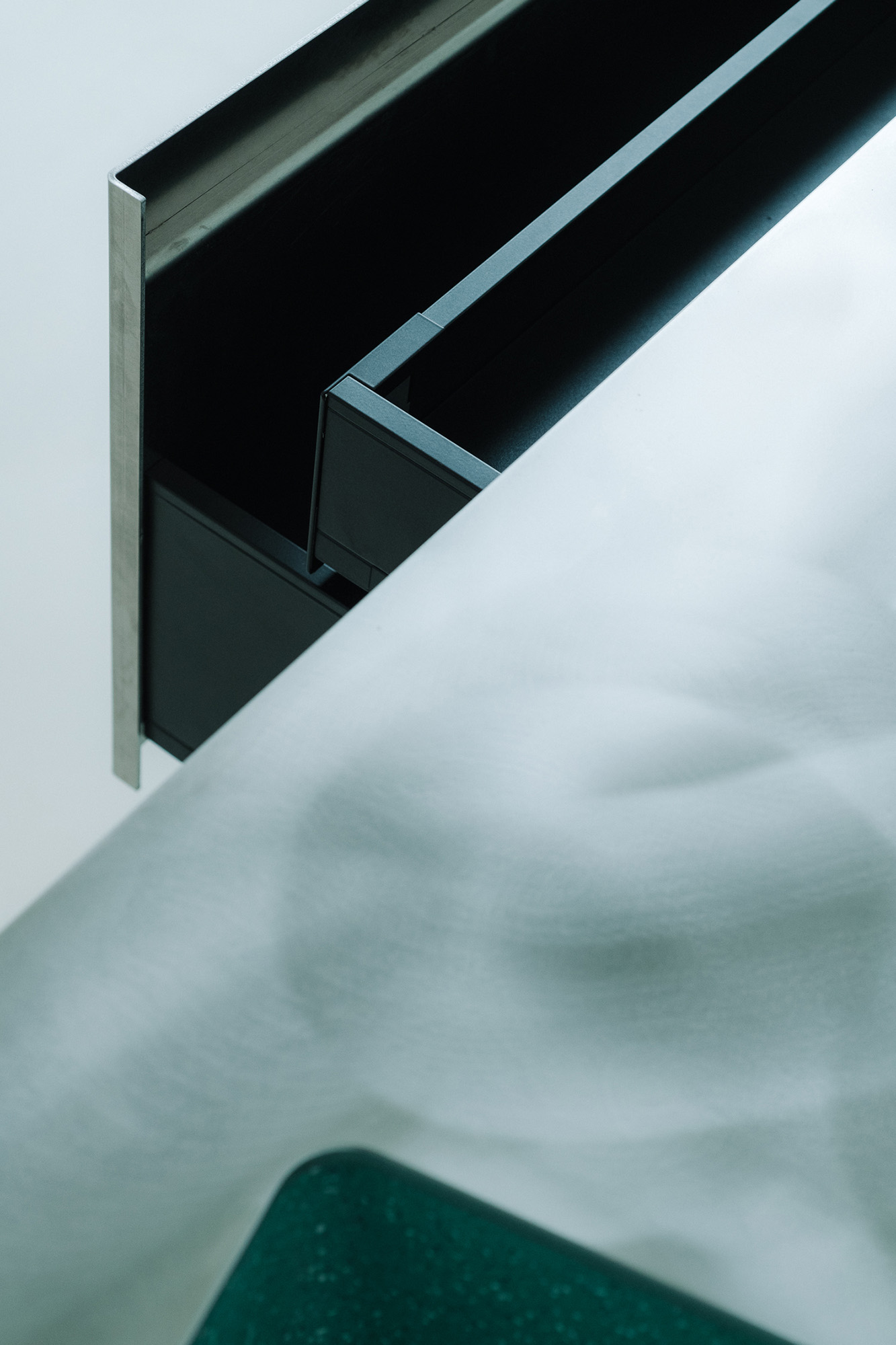 Hitomi is based on a parametric and modular kitchen design. The bended aluminium panels with the internal fronts are the result of a fundamental change in the design of the cabinets.  Those can be set as classic kitchen units, free-standing or in clusters. Individual work areas, such as the sink or cooking area, are optionally bordered with aluminium aprons at the height of the worktop. All connections have been designed to be detachable, are explicitly visible and allow all components to be replaced.