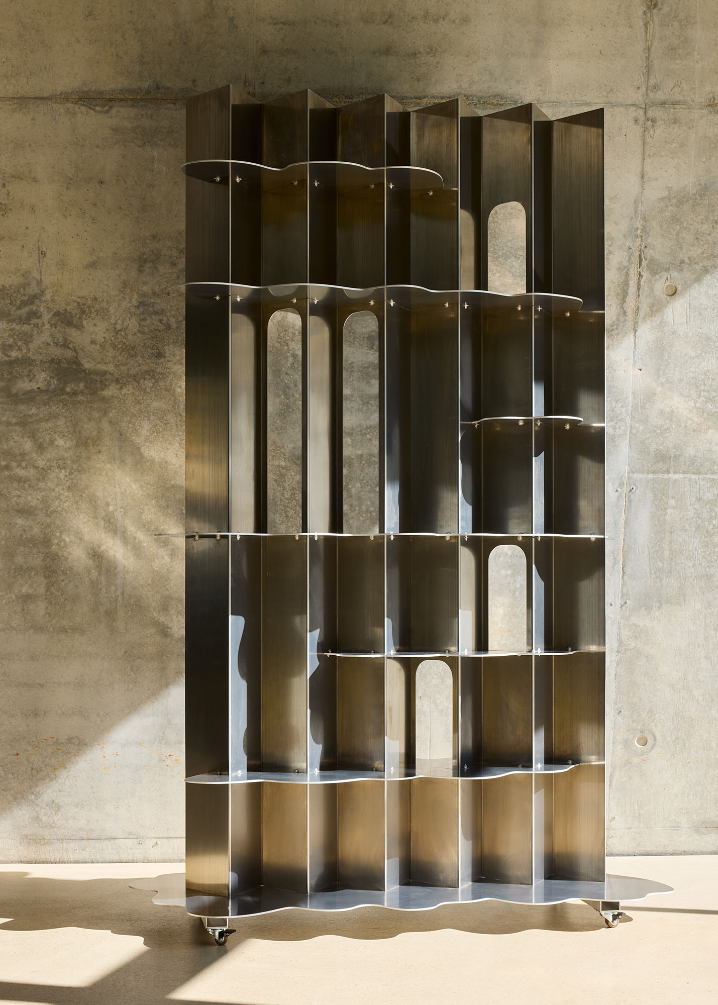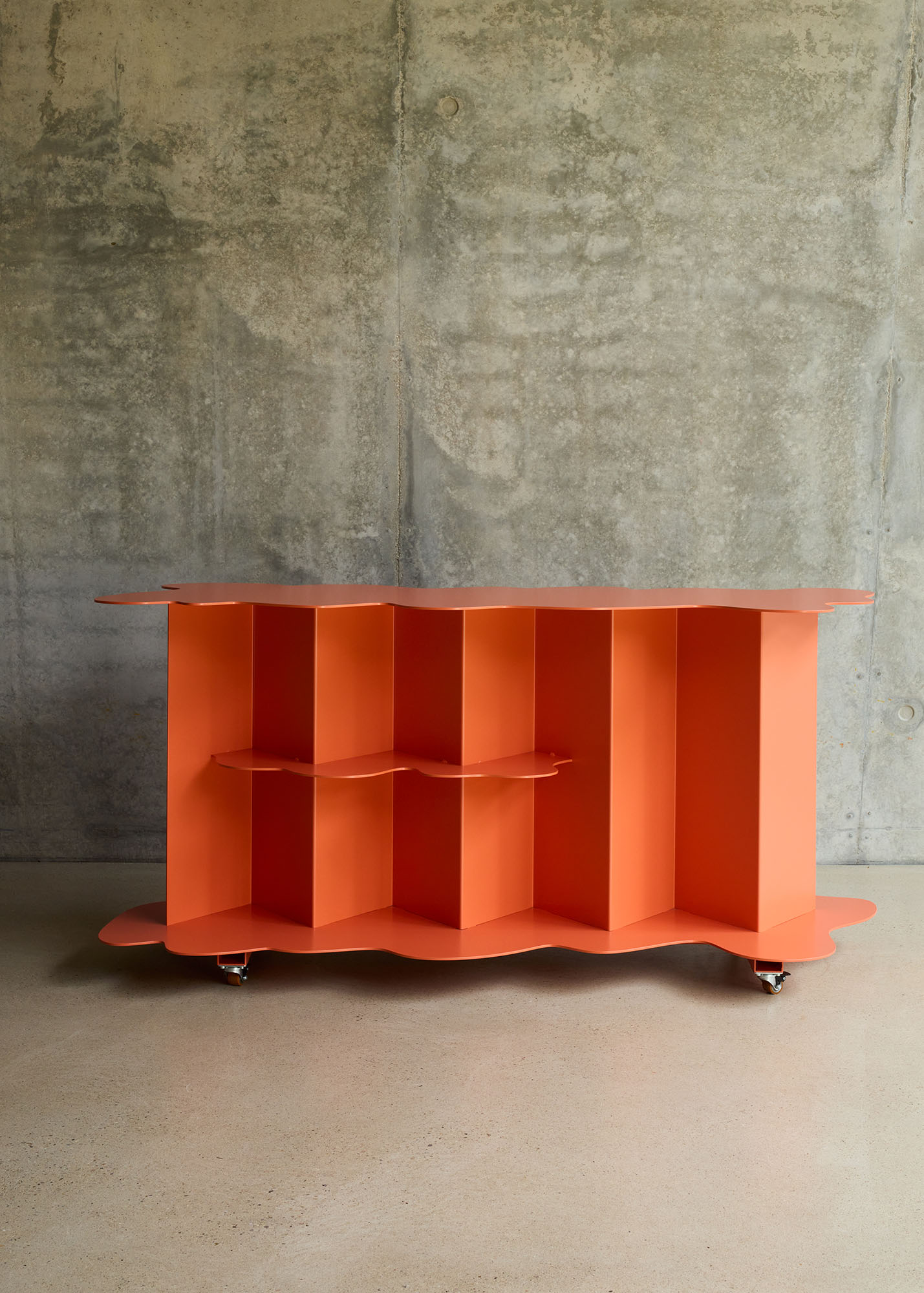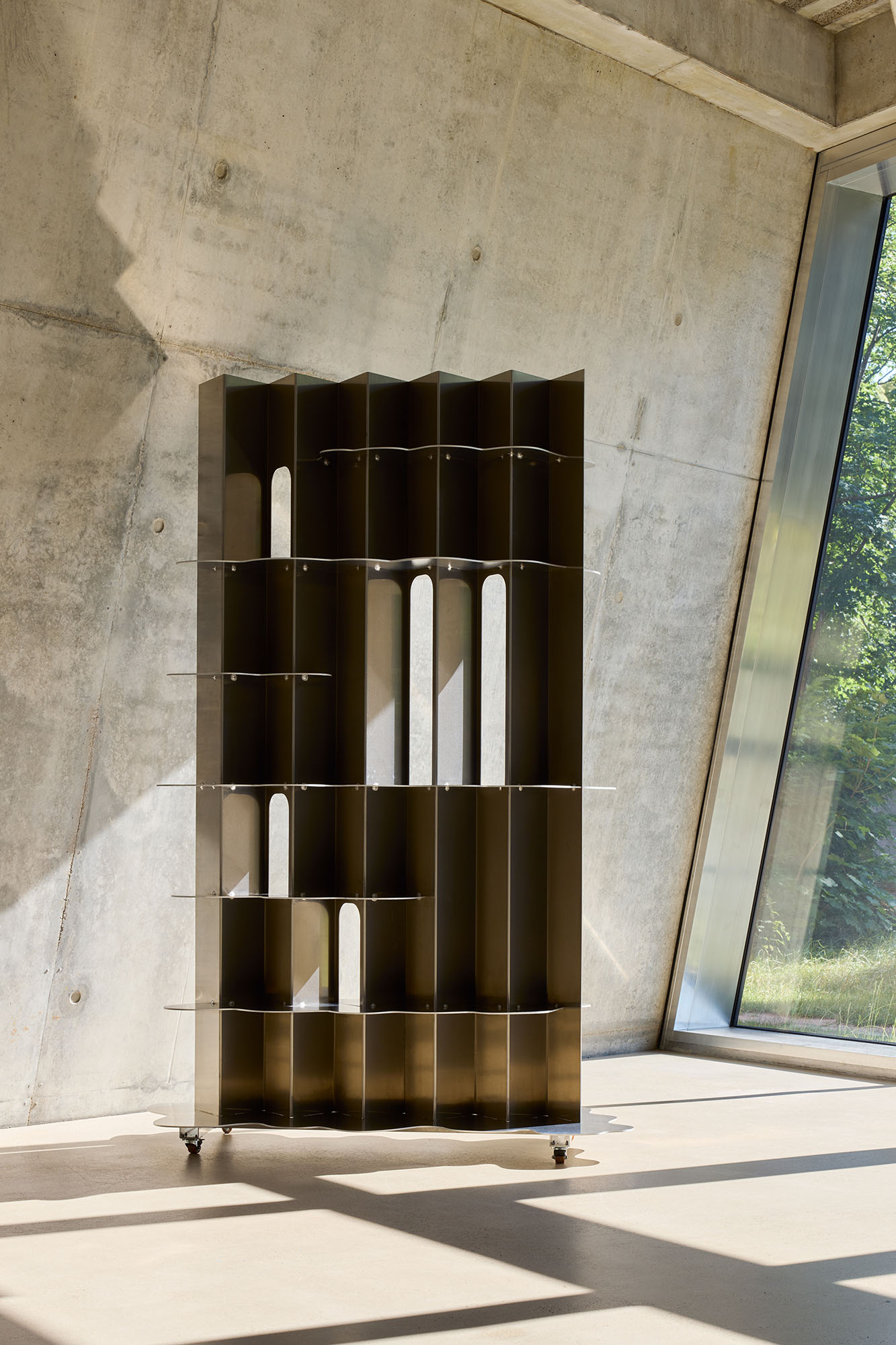 Inspired by corrugated sheet metal, these shelfs combine industrial aesthetics with playful details. The ZigZag Shelf features angled shelves, showcasing book spines and covers, while its cloud-like contours soften the technical design. Made from raw aluminum and set on castors, it’s both practical and striking. The compact variation, the ZigZag Sideboard, crafted from powder-coated aluminum, serves as a half-height room divider—perfect for smaller spaces. Both pieces are functional, dynamic, and uniquely versatile.