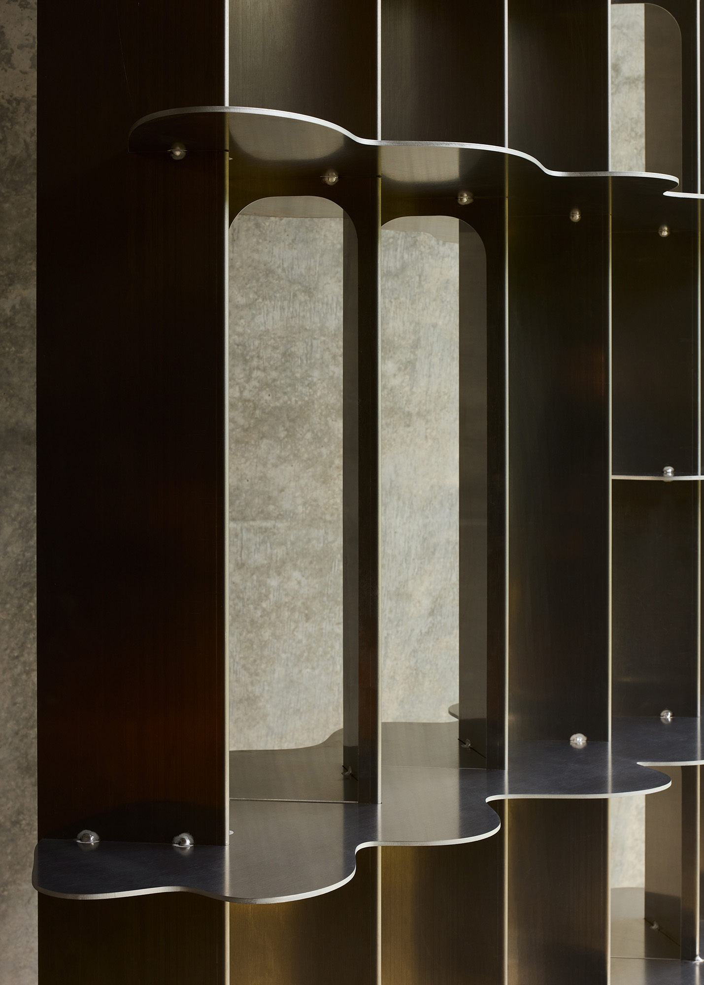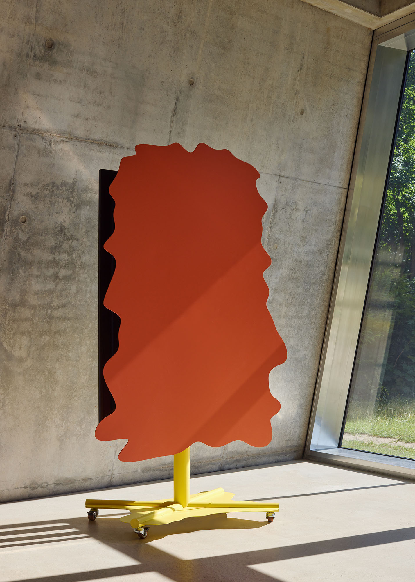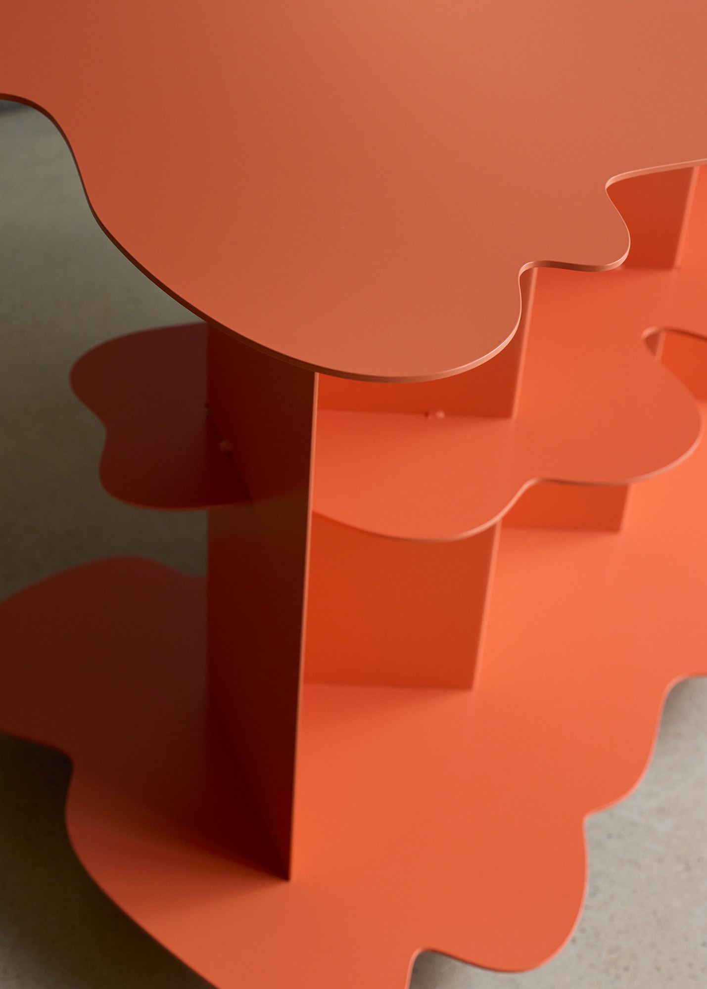 Inspired by corrugated sheet metal, these shelfs combine industrial aesthetics with playful details. The ZigZag Shelf features angled shelves, showcasing book spines and covers, while its cloud-like contours soften the technical design. Made from raw aluminum and set on castors, it’s both practical and striking. The compact variation, the ZigZag Sideboard, crafted from powder-coated aluminum, serves as a half-height room divider—perfect for smaller spaces. Both pieces are functional, dynamic, and uniquely versatile.